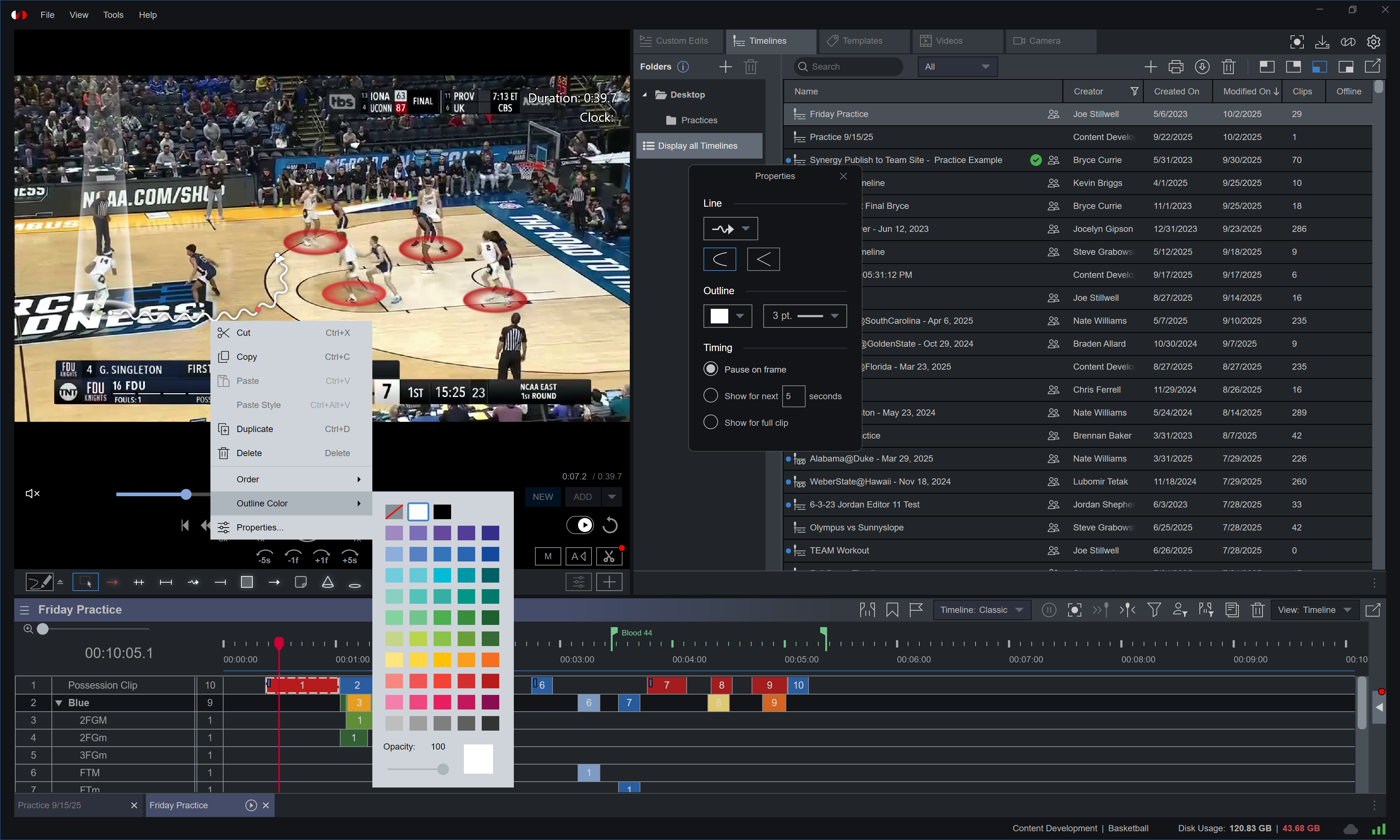 When the Overlay menu is closed, click and hold the cursor over the screen at any time to instantly pause and draw. Your drawings will be erase in a few seconds when playback resumes. Live telestration is available when playing both clips and timelines.