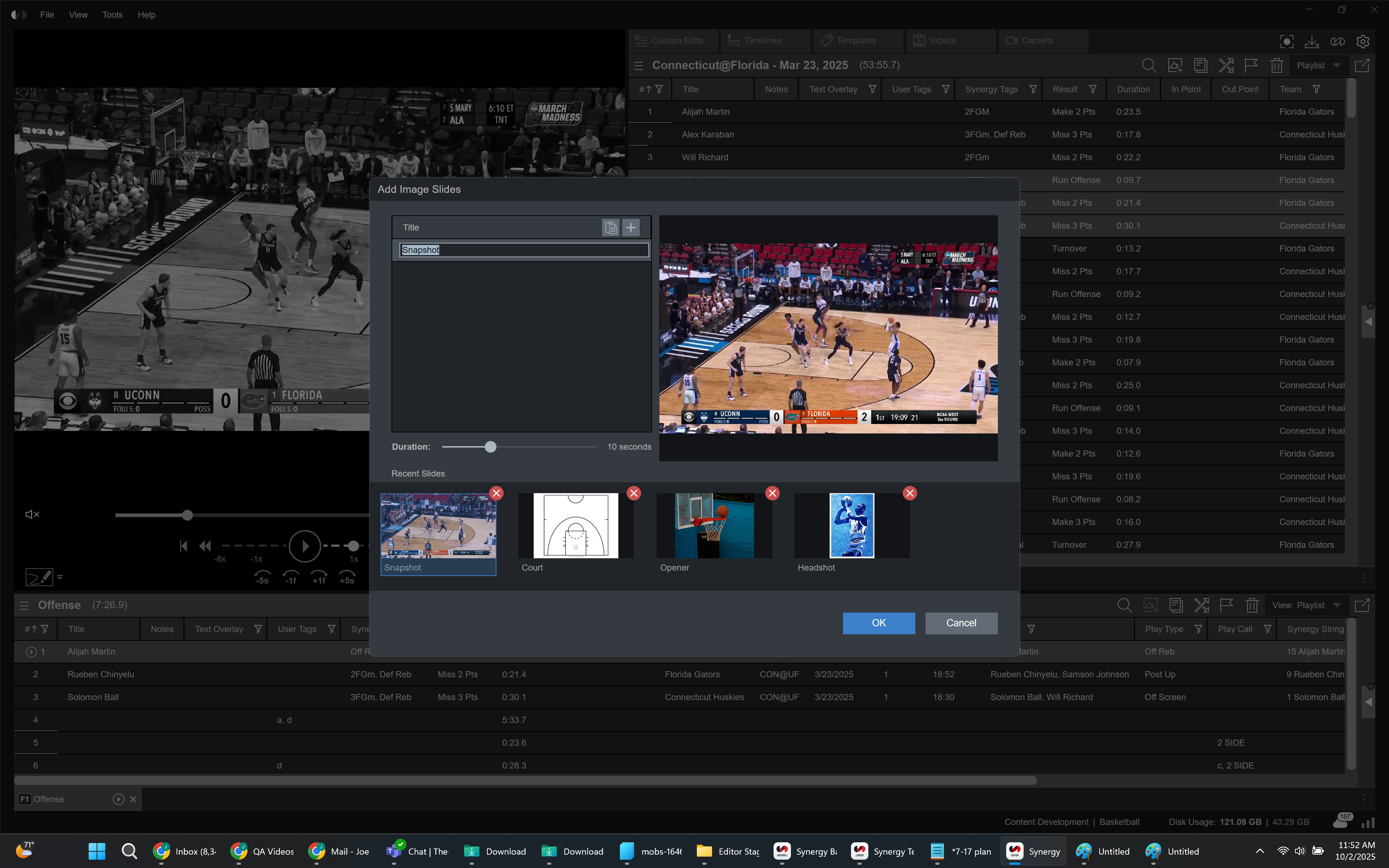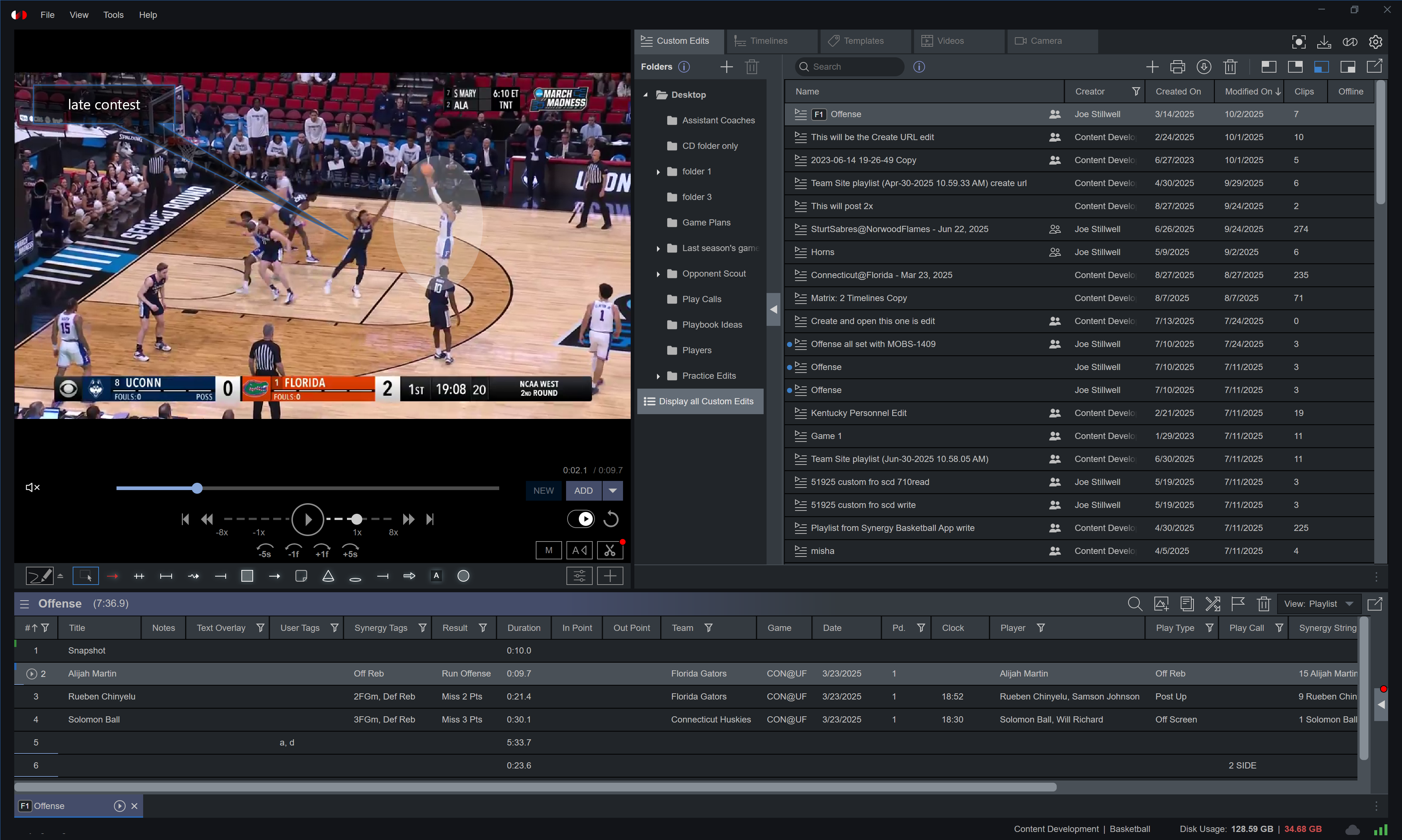 A shot chart can be placed on Tagging Templates for adding plot points to practice clips. The completed chart can be pulled out from Timeline, Playlist, or Sequencer view. Plot points appear in red for made field goals, blue for missed, or gray when not attached to shots.