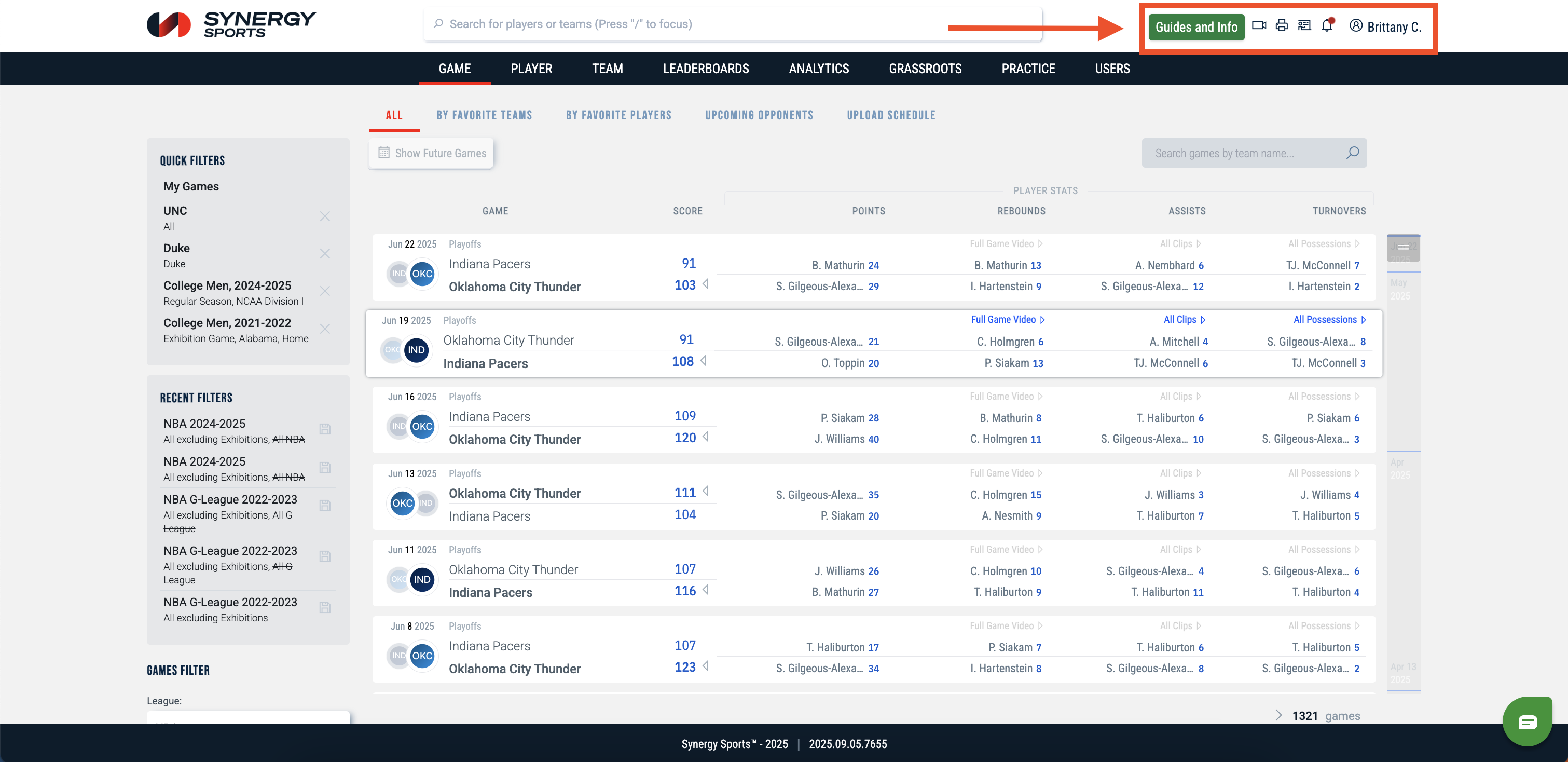 Once you have logged in, you will be redirected to the Games page. From here, you can access all of the tabs, filters, and navigation tools in Team Site.