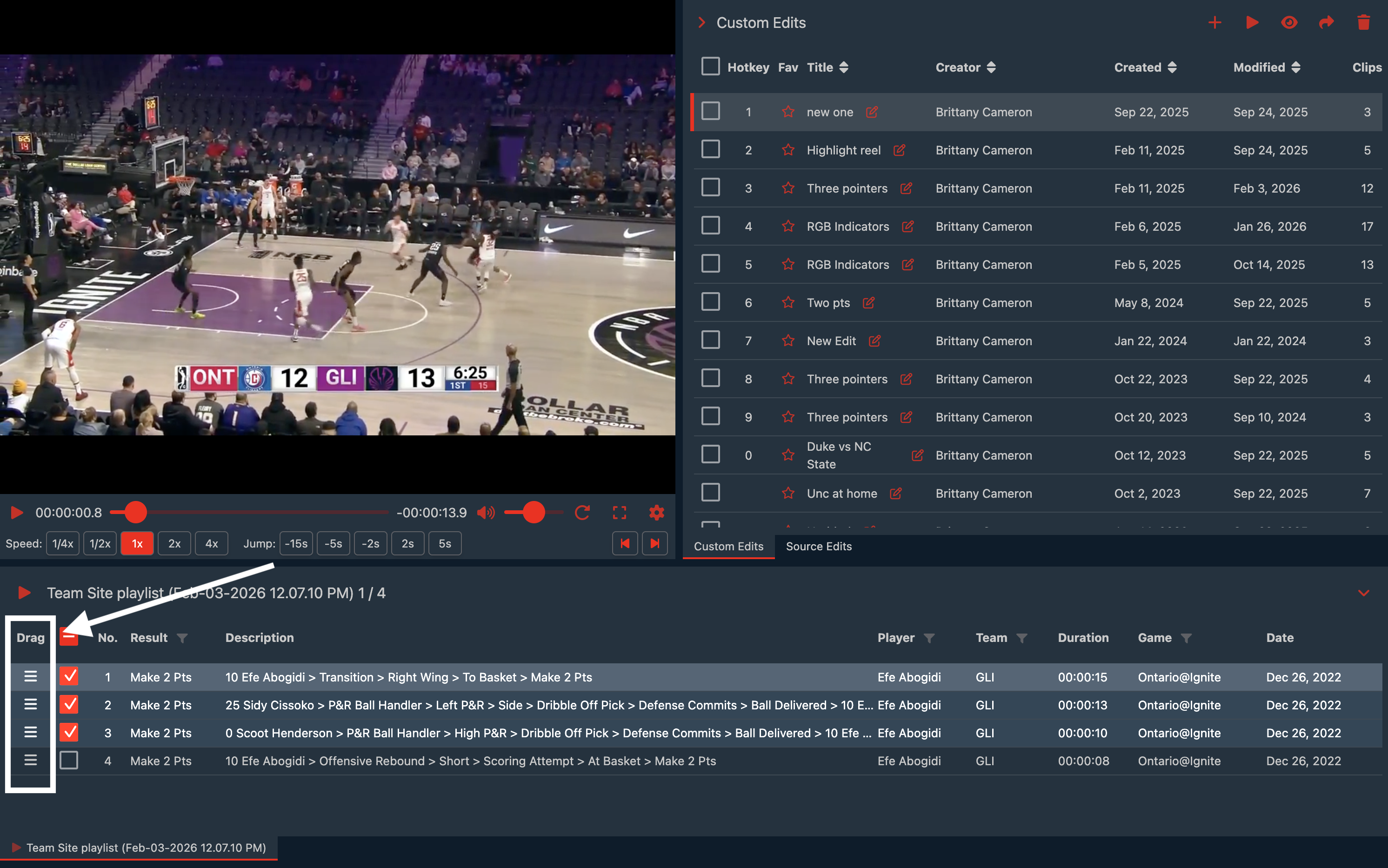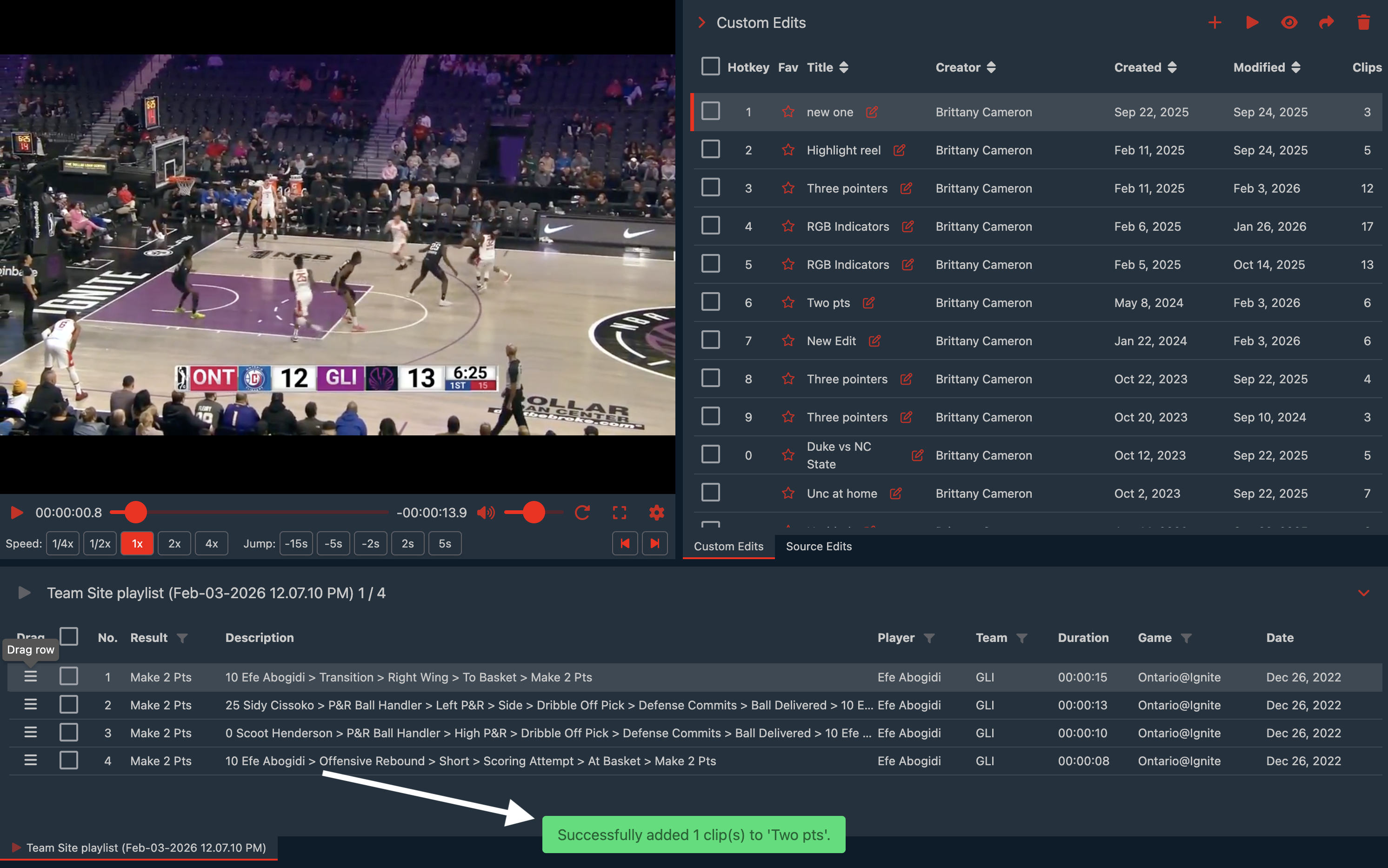 The In-Browser Player will open with the clips you selected from Team Site at the bottom. Your Custom Edits and Source Edits will be on the right.