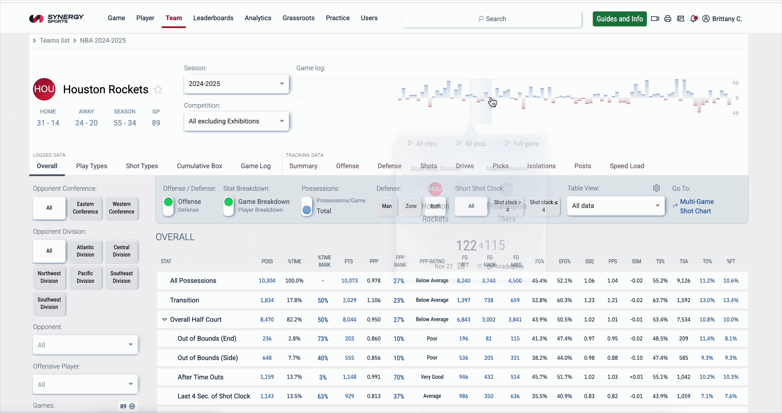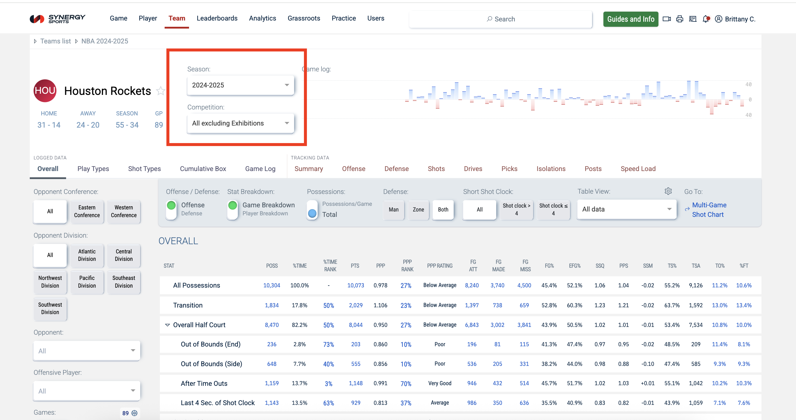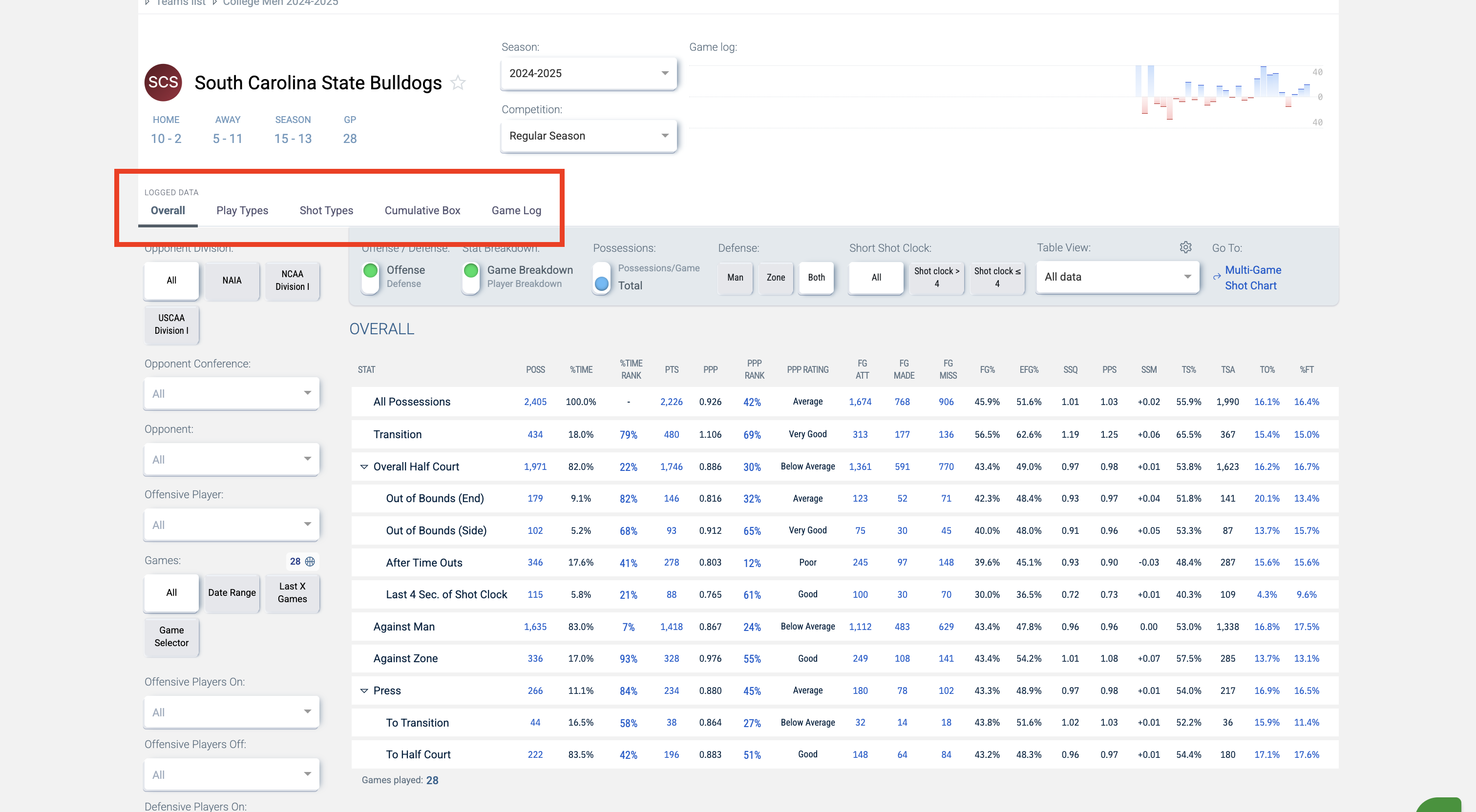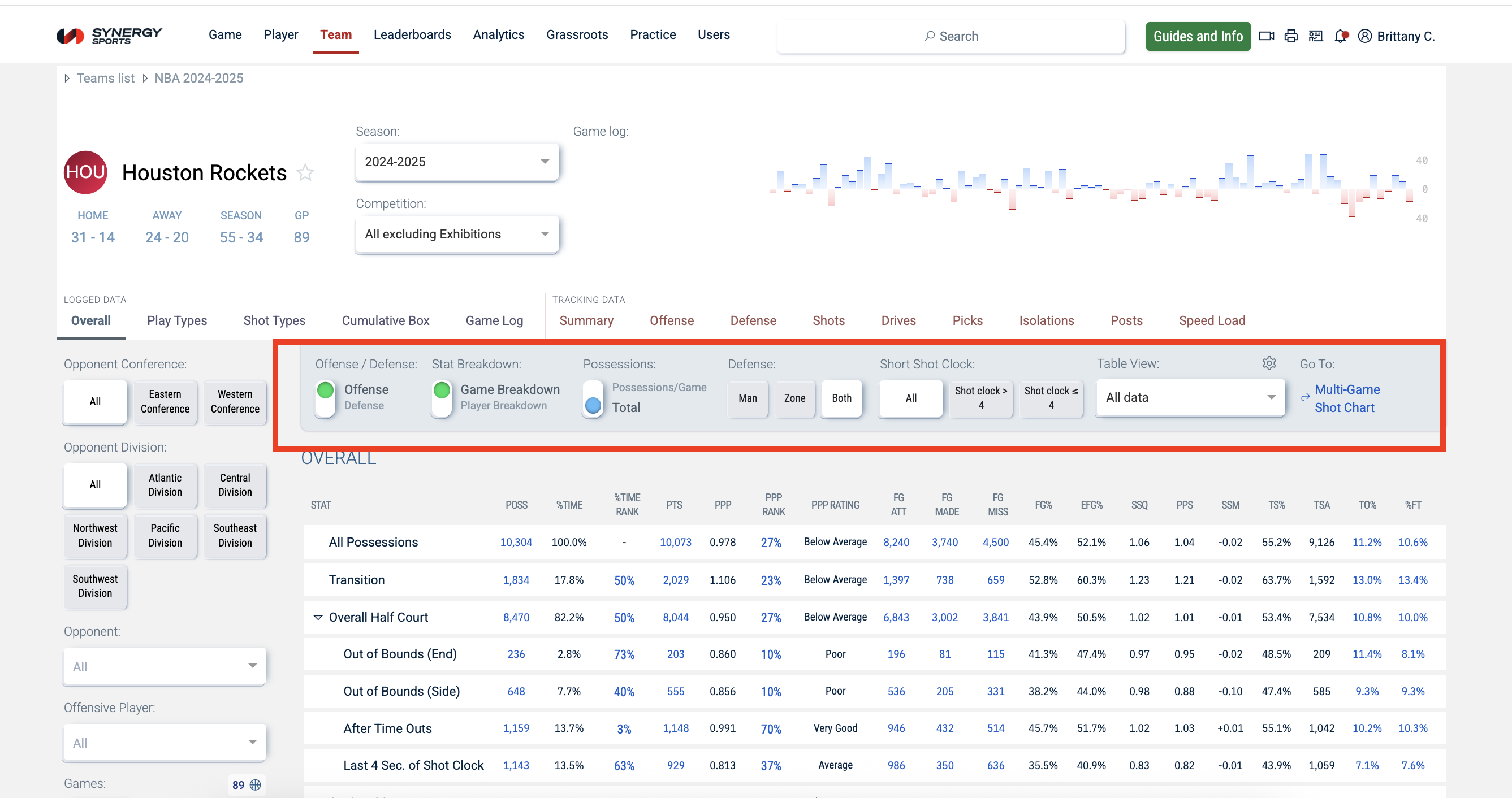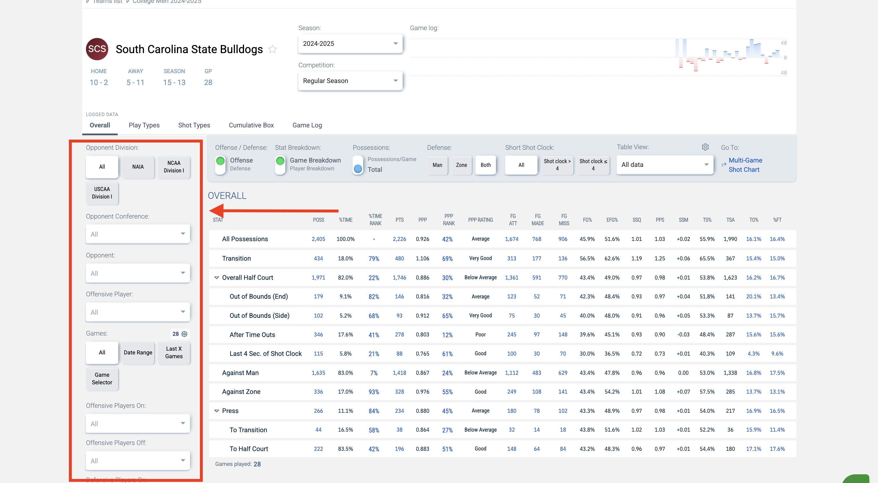 If you have Advanced Analytics, you will see additional filters on the left. These will allow you to filter opponents by division/conference and filter on/off lineup combinations.
