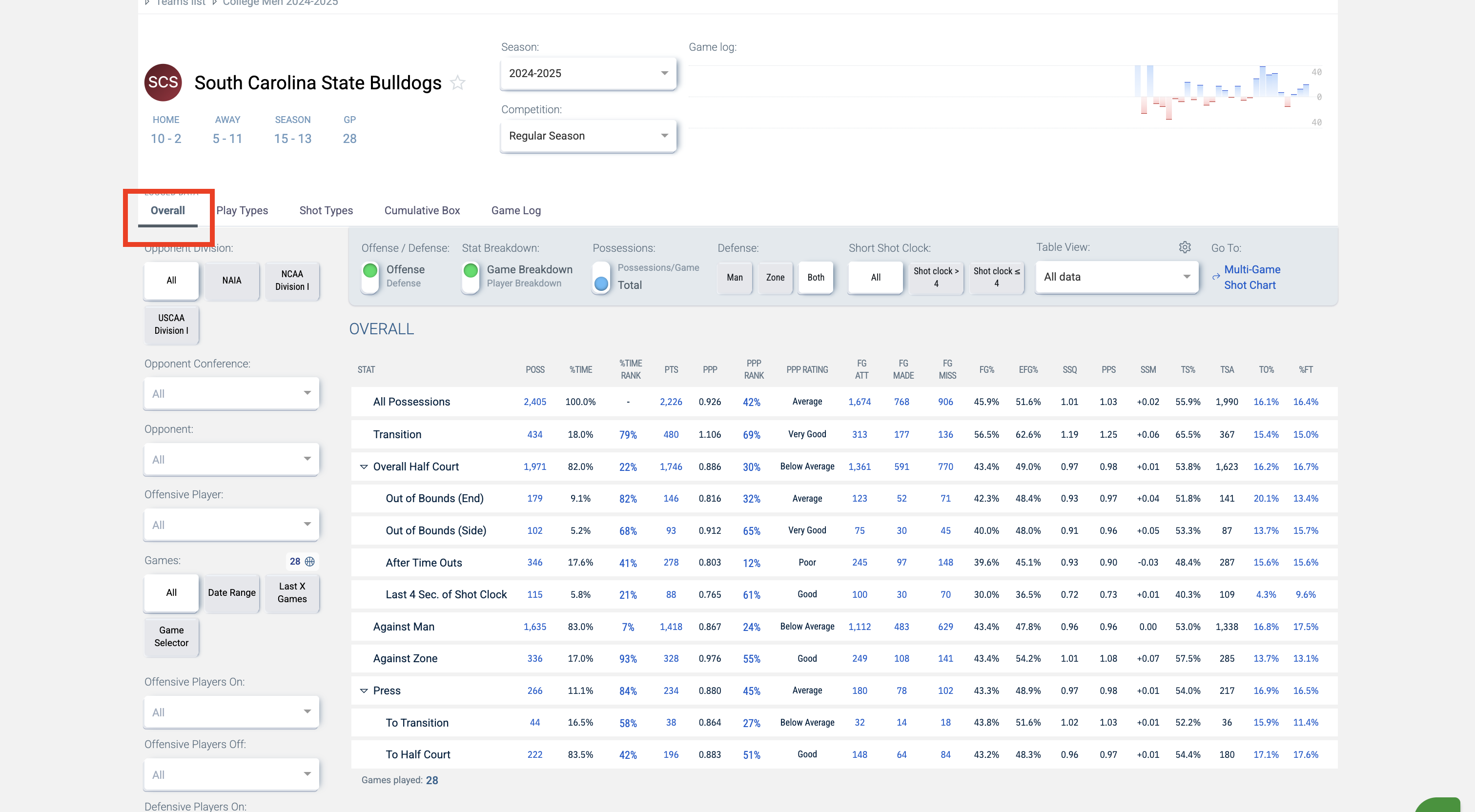 The Team Stats page defaults to the Overall view. This view currently provides a look at a team's Overall stats and Per Game Breakdown.