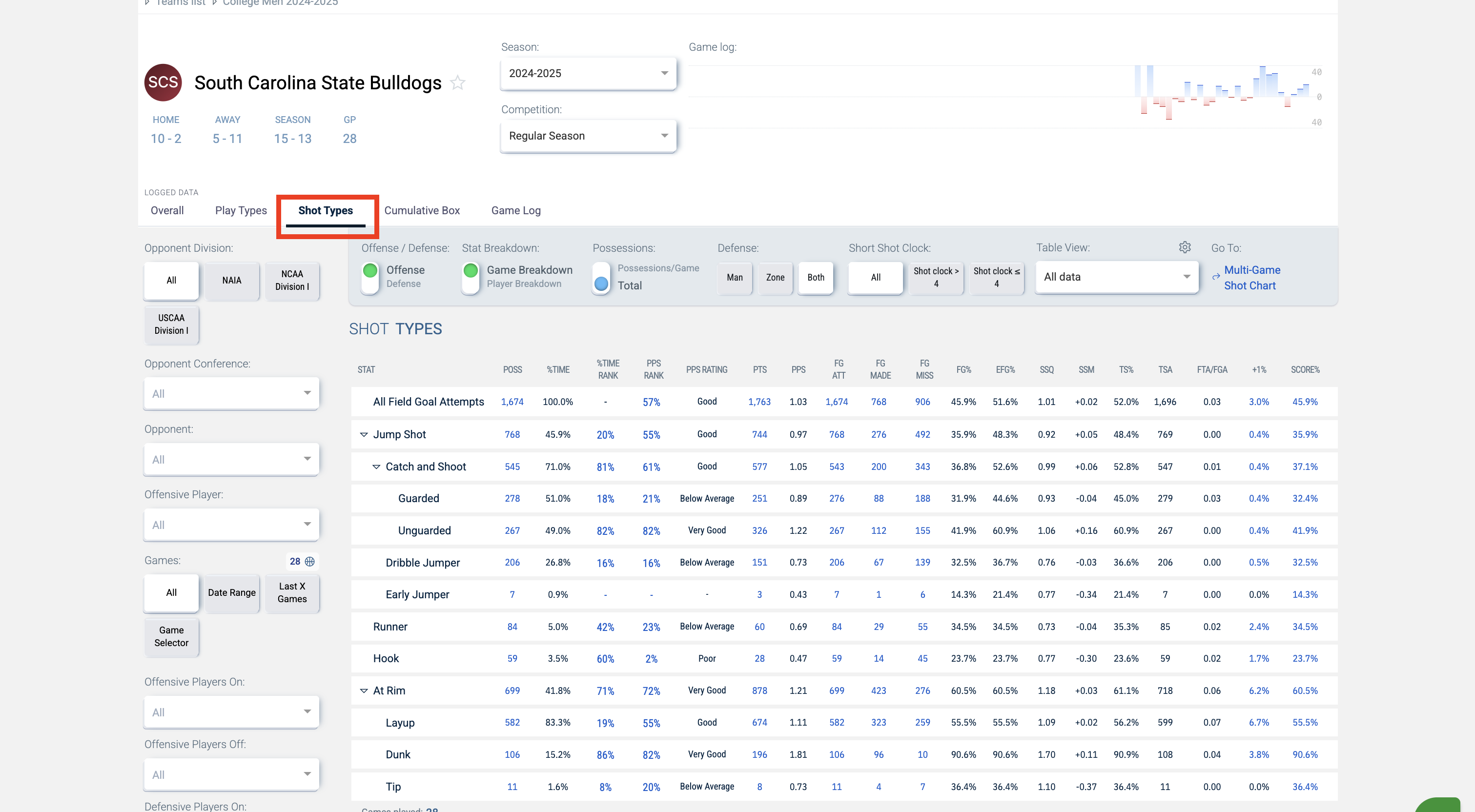 Clicking the Shot Types view will load the Shot Type stats tables. These tables cover Shot Types, Shot Distances (Jumpers), Shot Quality, and Per Game Breakdown.