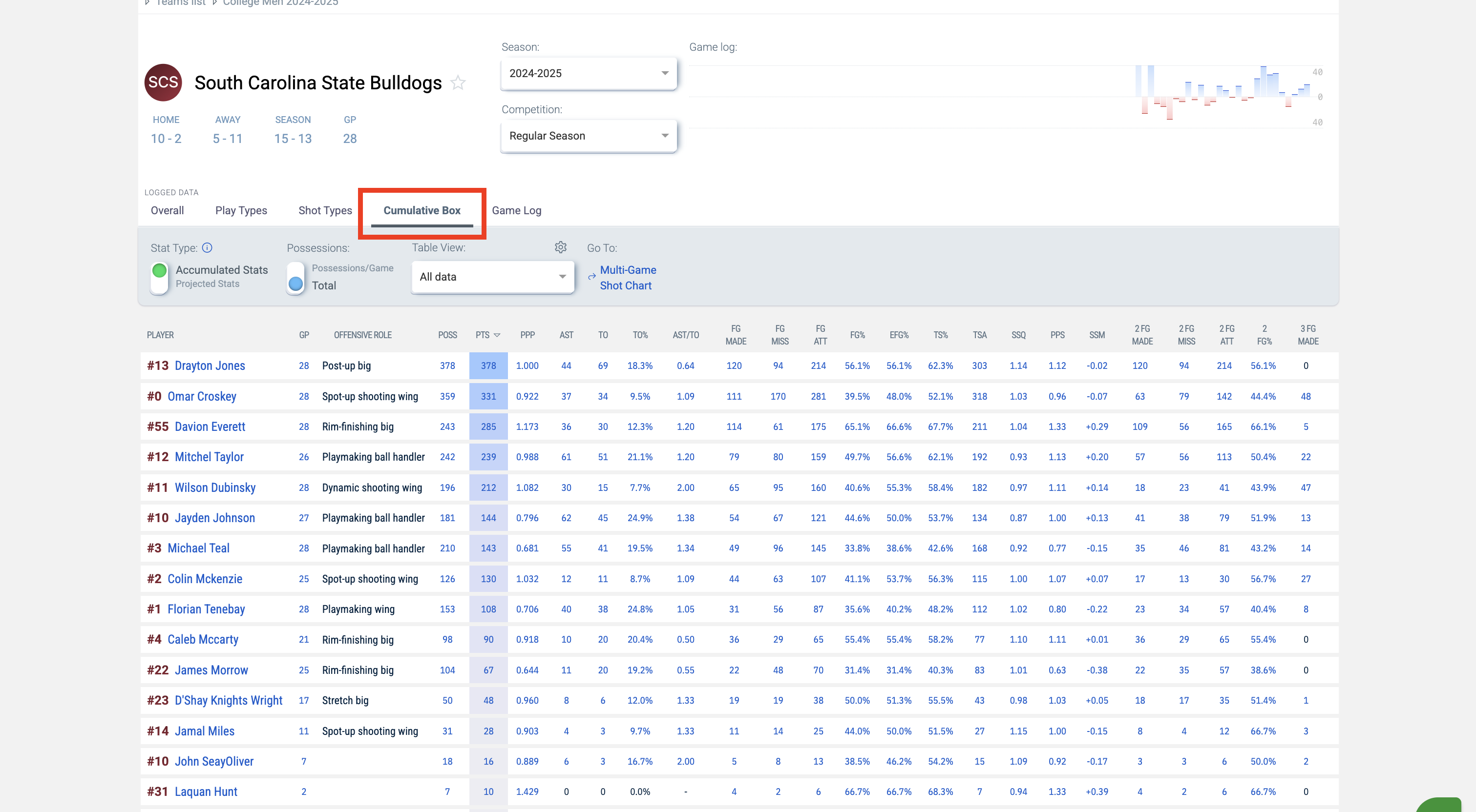 Clicking this view will load the Cumulative Boxscore stats tables for all players.