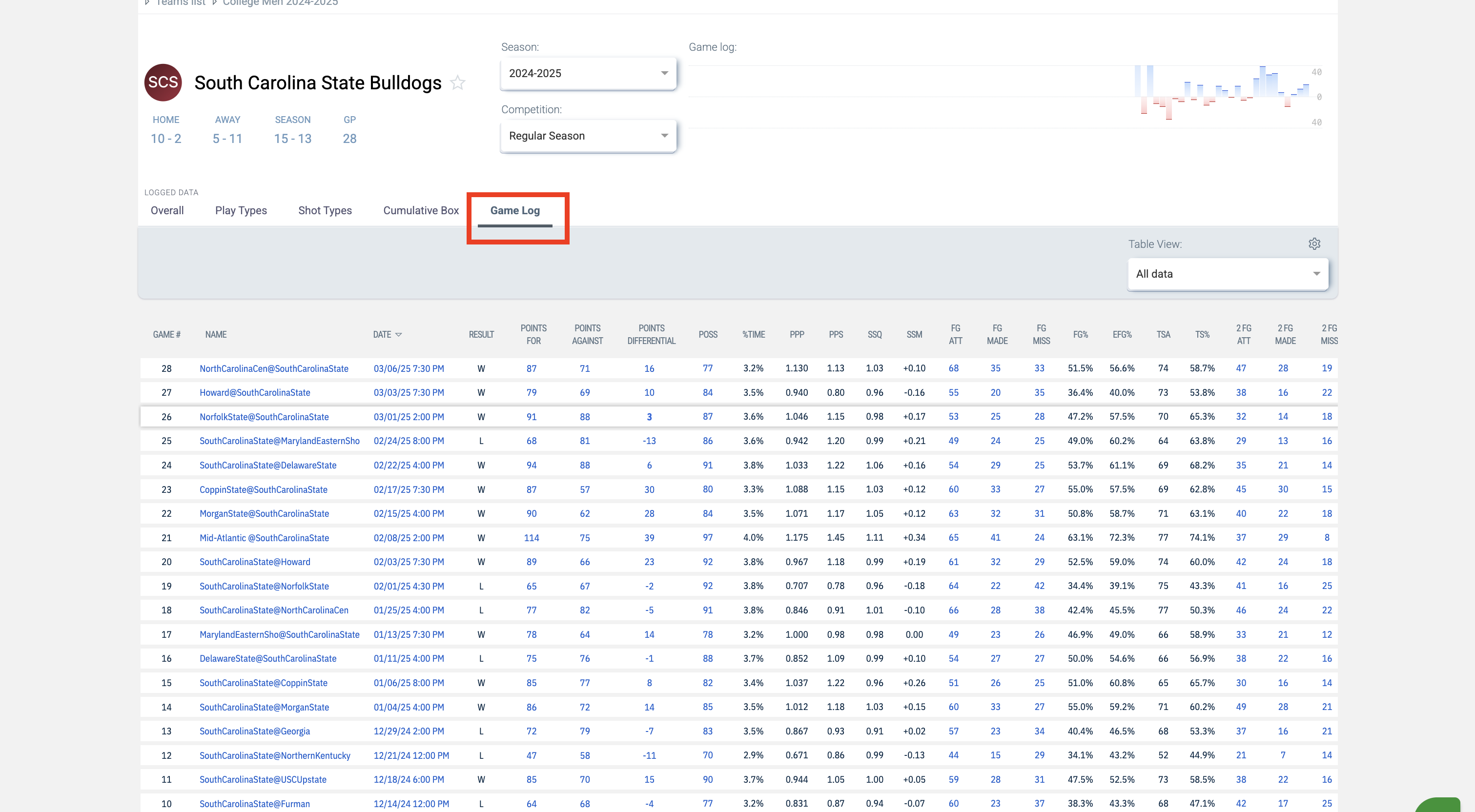 The Game Log is only accessible to users with Advanced Analytics. Click on the Game Log to see all of the game results from the selected season.