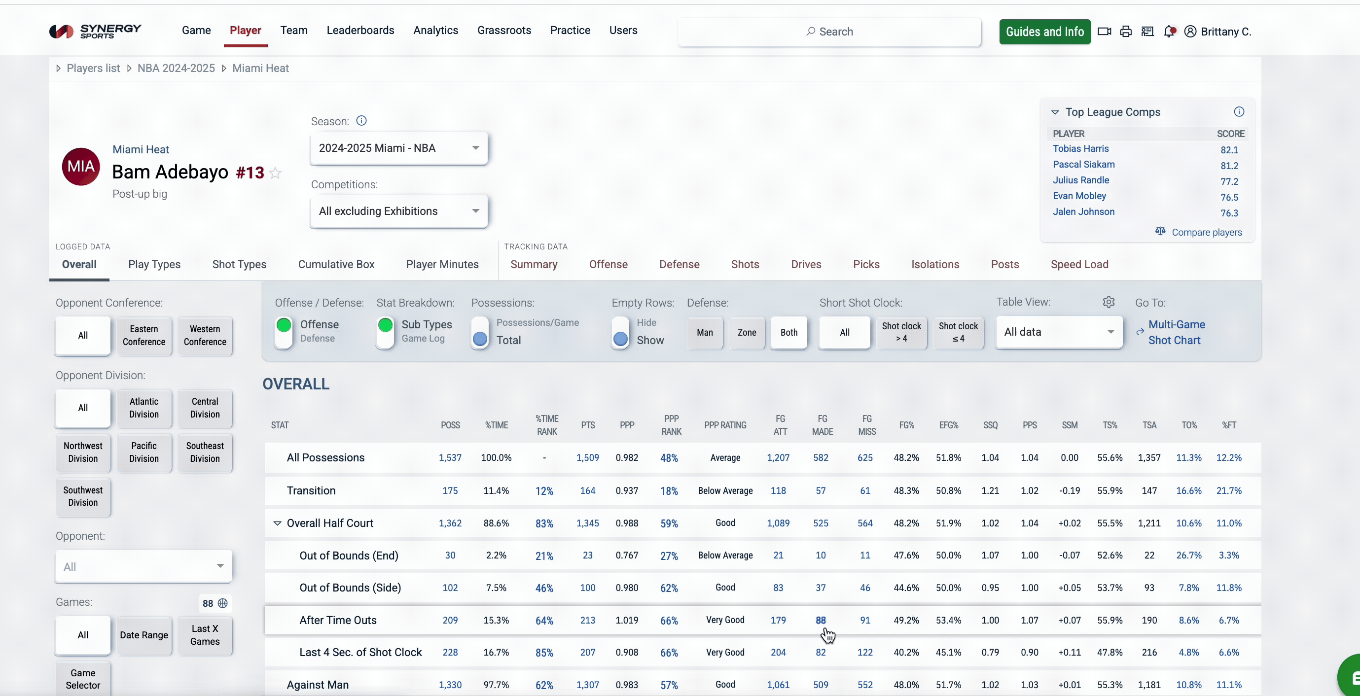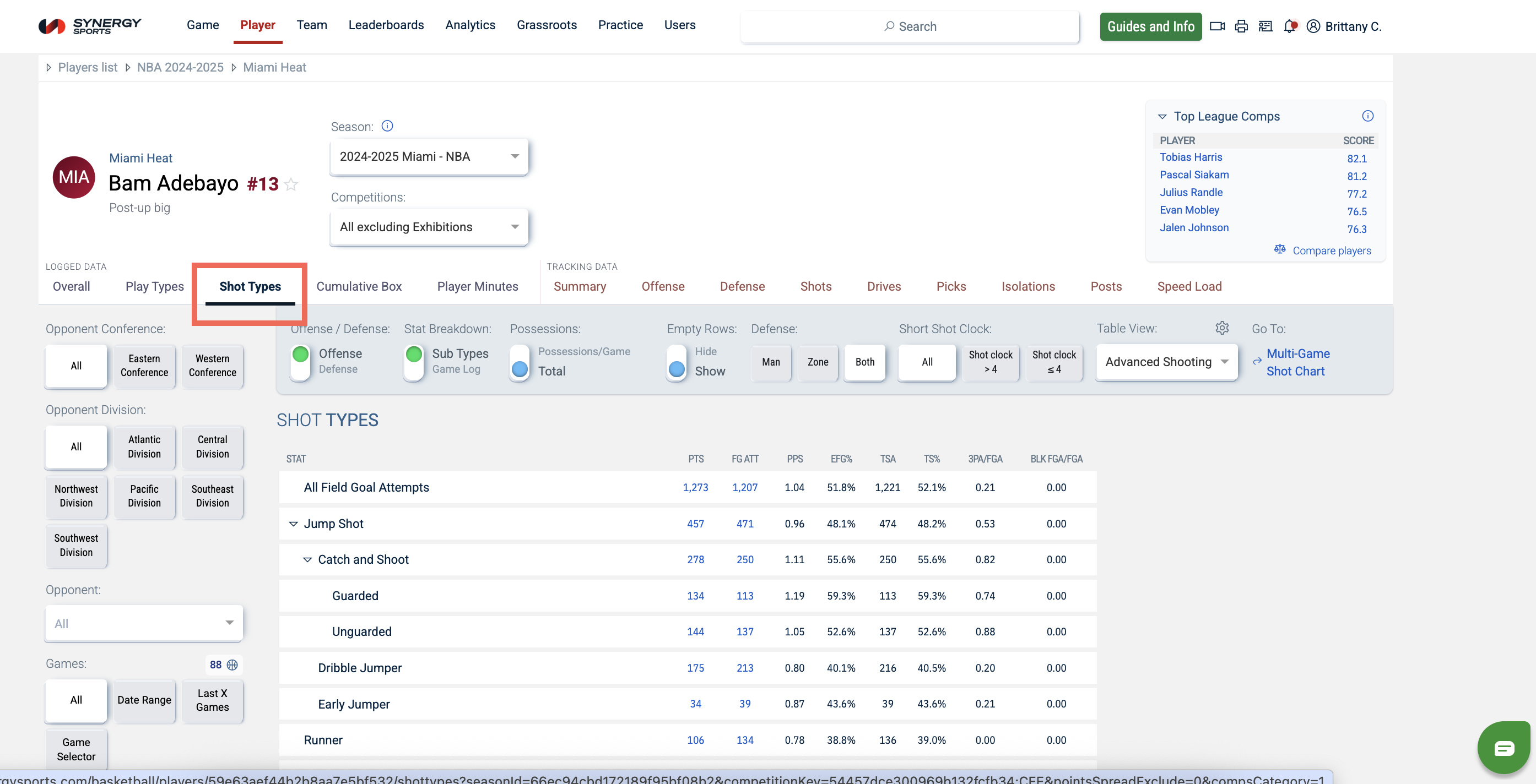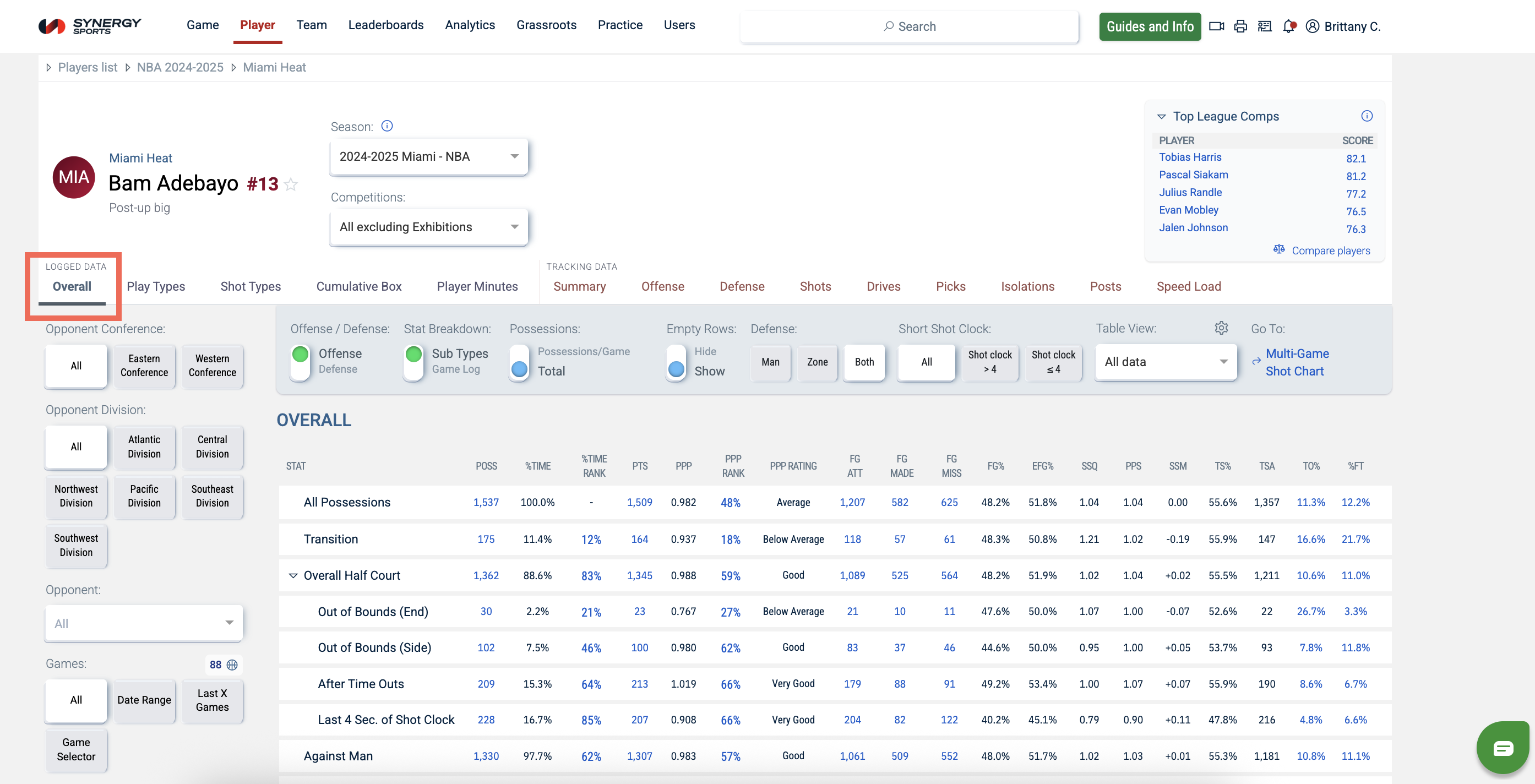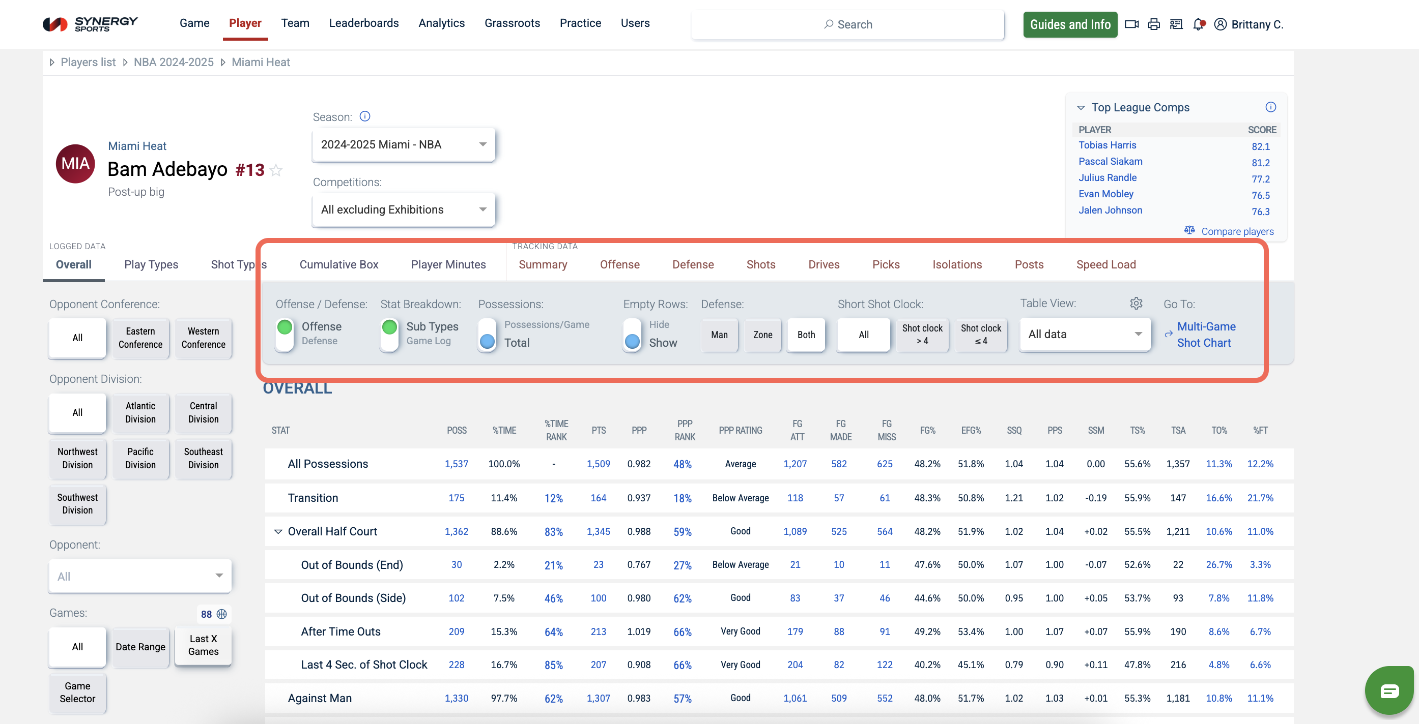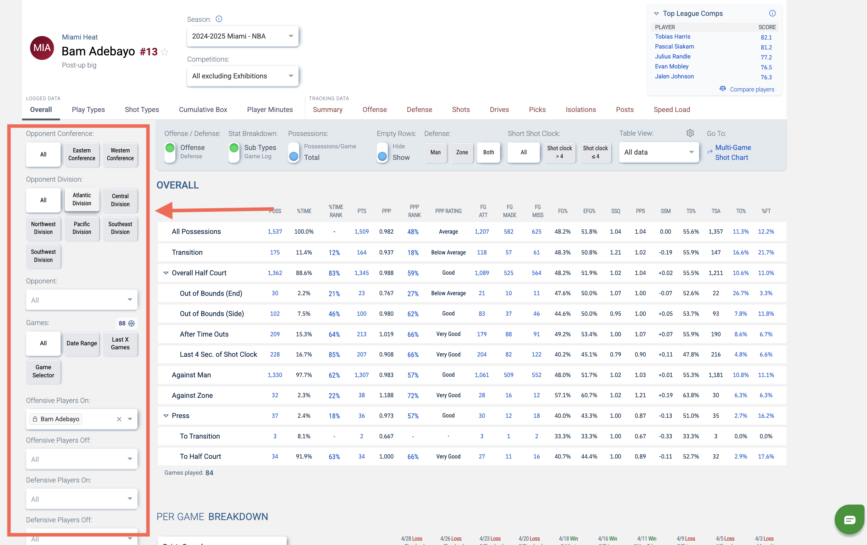 If you have Advanced Analytics, you will see additional filters on the left. These will allow you to filter opponents by division/conference and filter on/off lineup combinations.