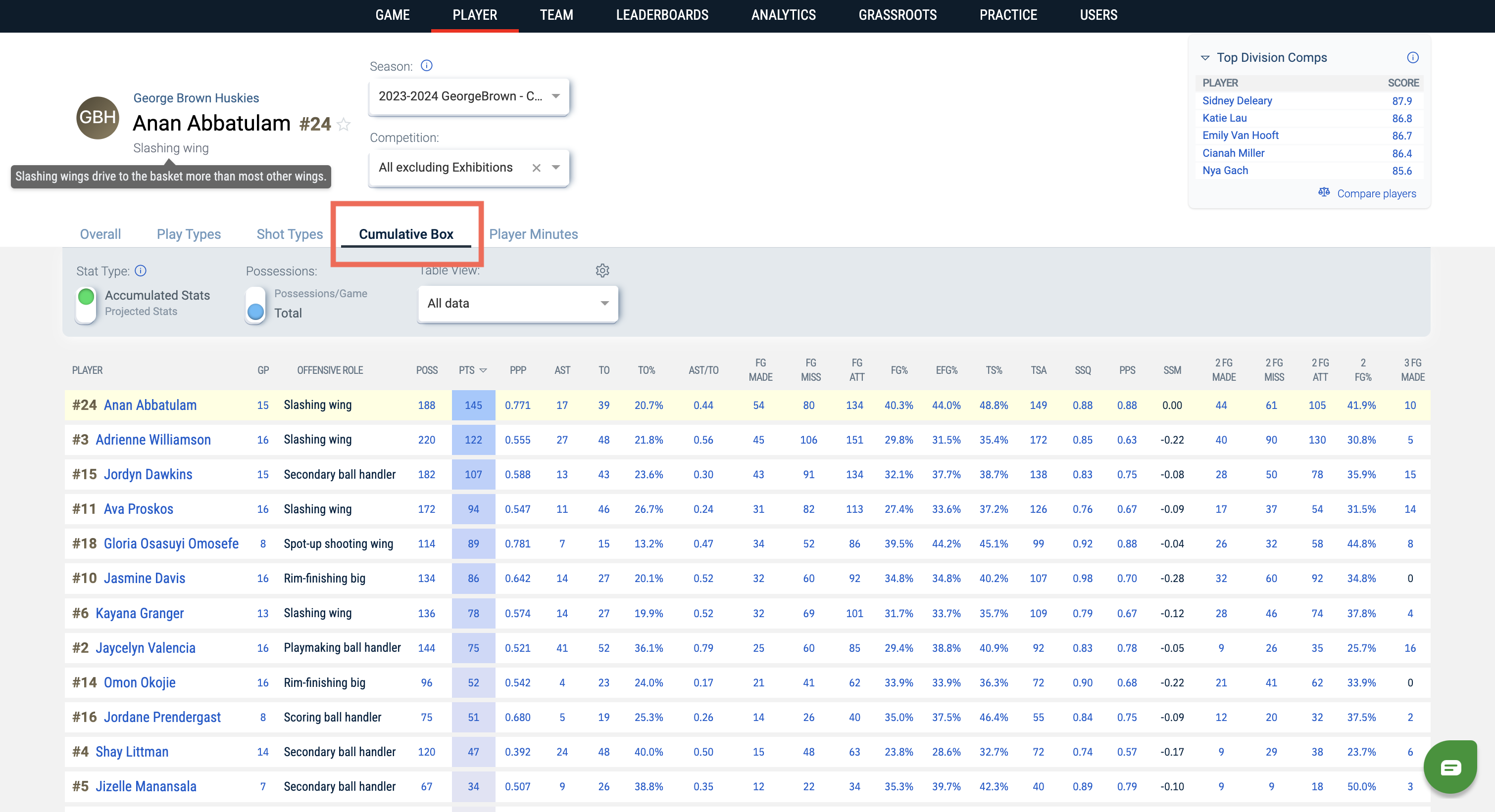 Clicking this view will load the Cumulative Box score stats tables for all players.