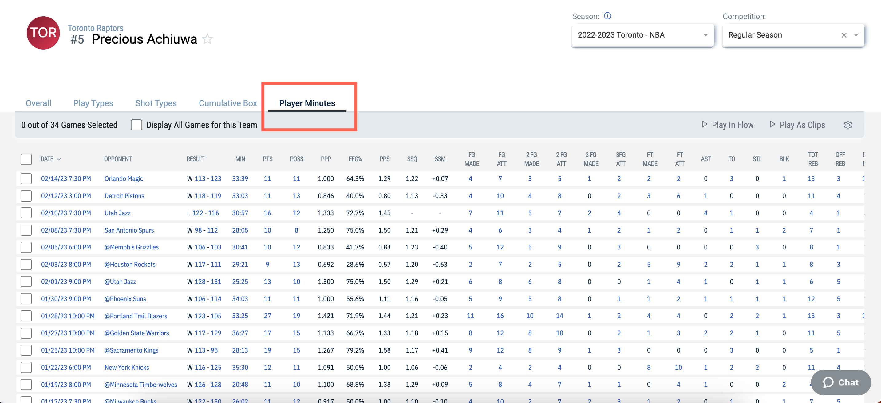 Clicking this view will load the Player Minutes stats table for the selected player. Select a game or multiple games to view video of player minutes in flow or as clips.