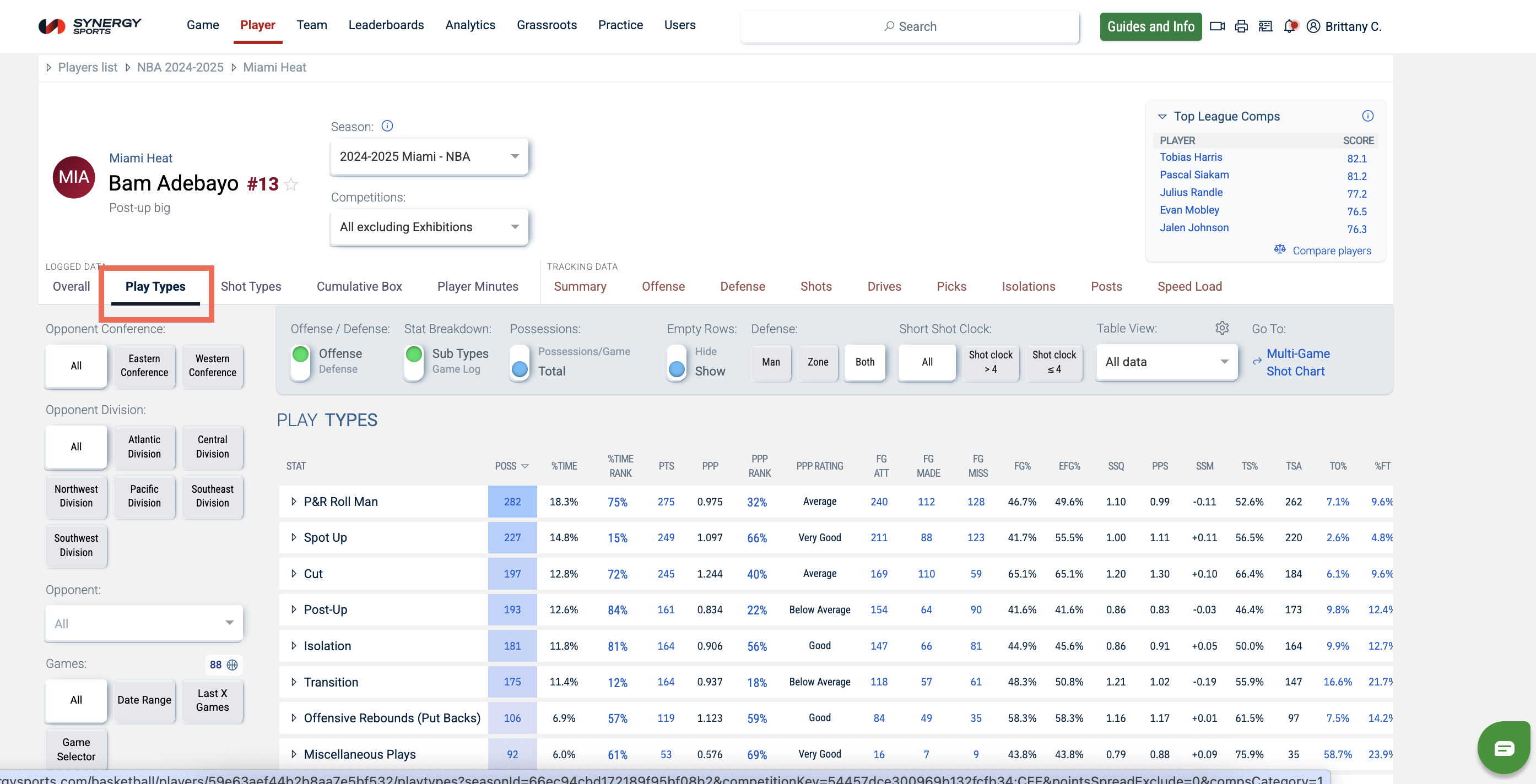 - Play Type: select whether to view stats when the play occurs in half court, transition, put backs, or all