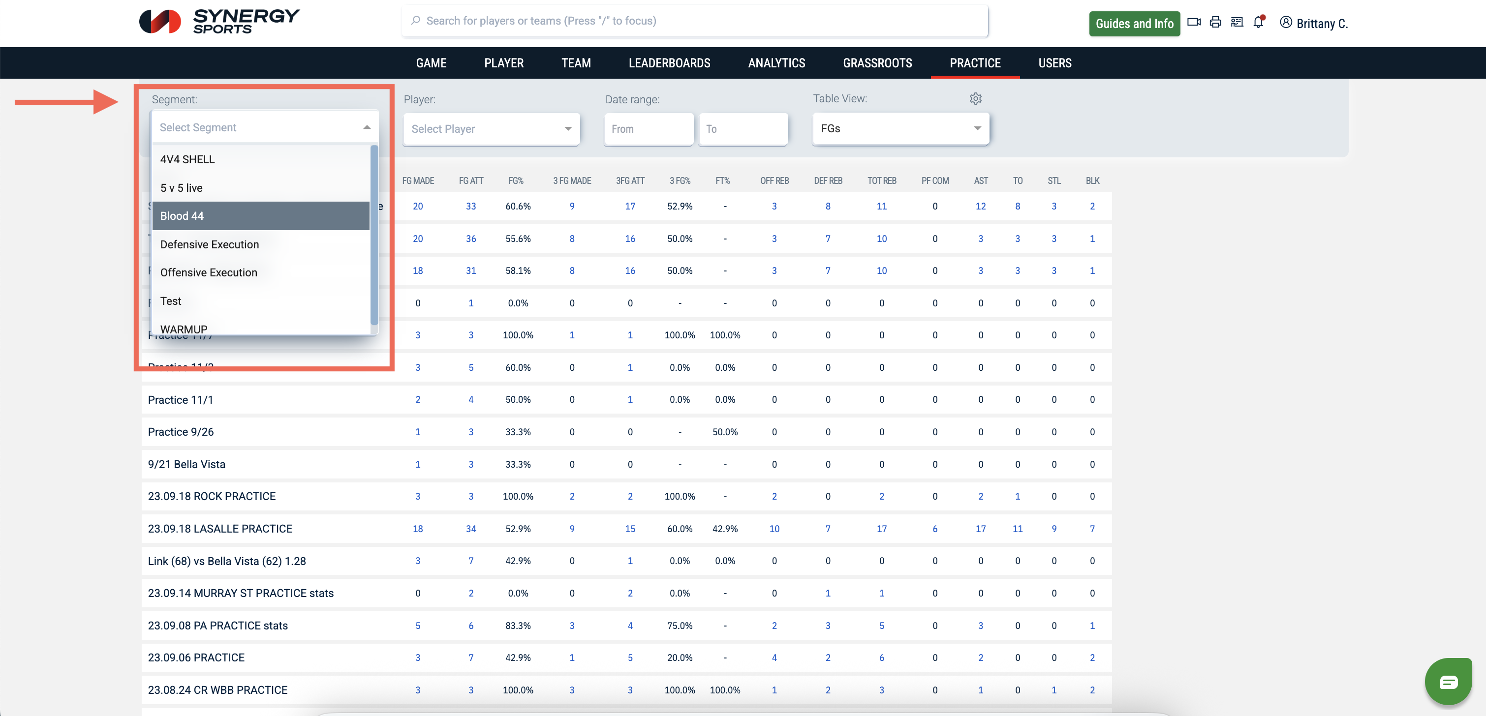 The Segment dropdown will allow you to select different drills that were used in practice. The segments that you see will be based on the segments that were created in the Editor.