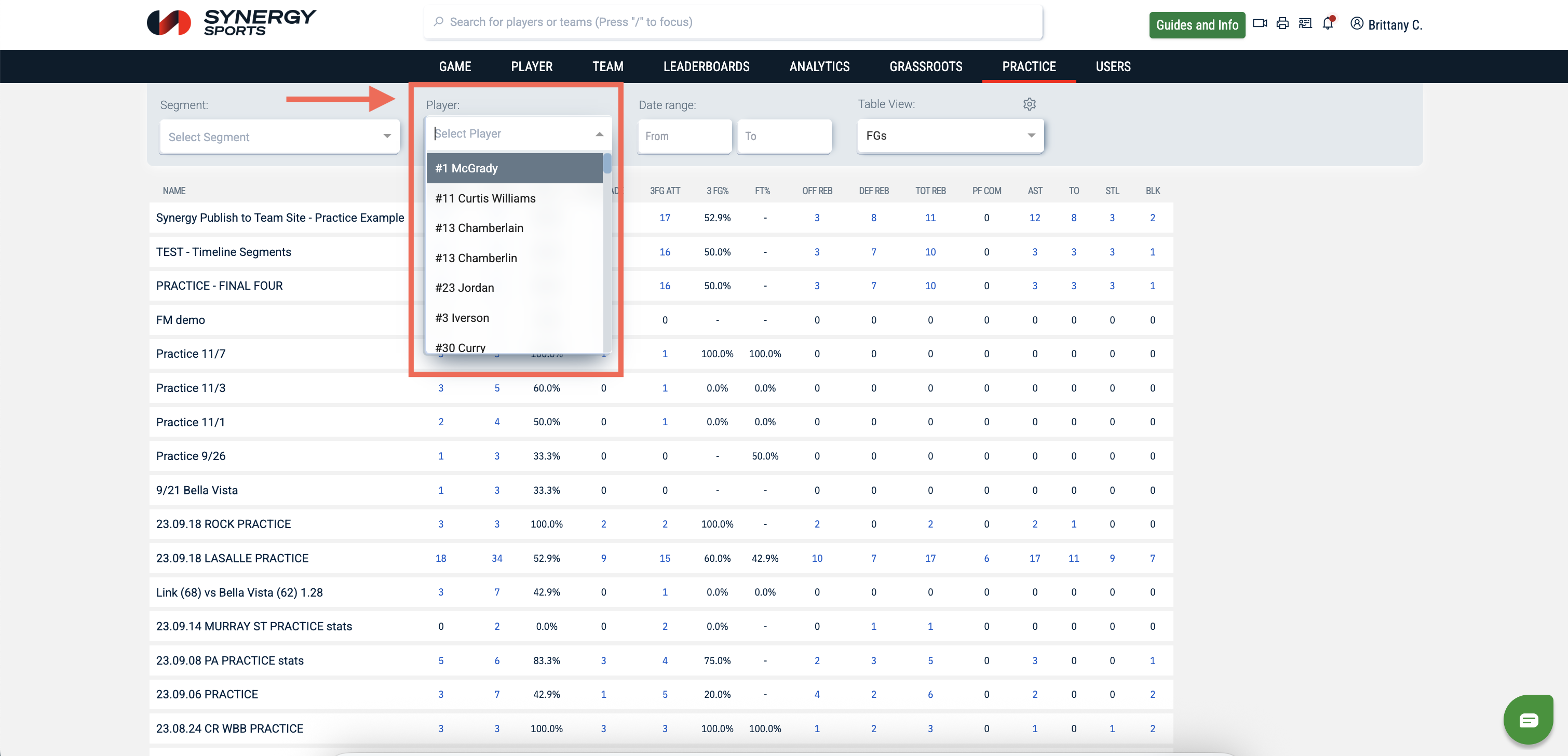 The Player dropdown will allow you to select a specific player. By selecting a player, you will be able to see their individual practice stats.