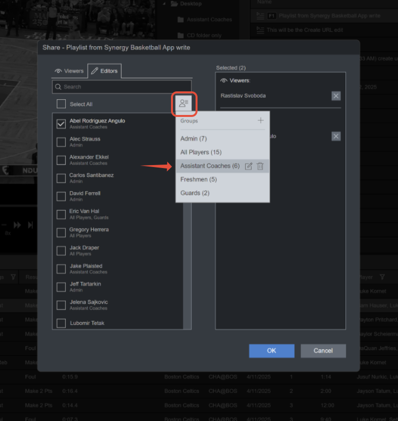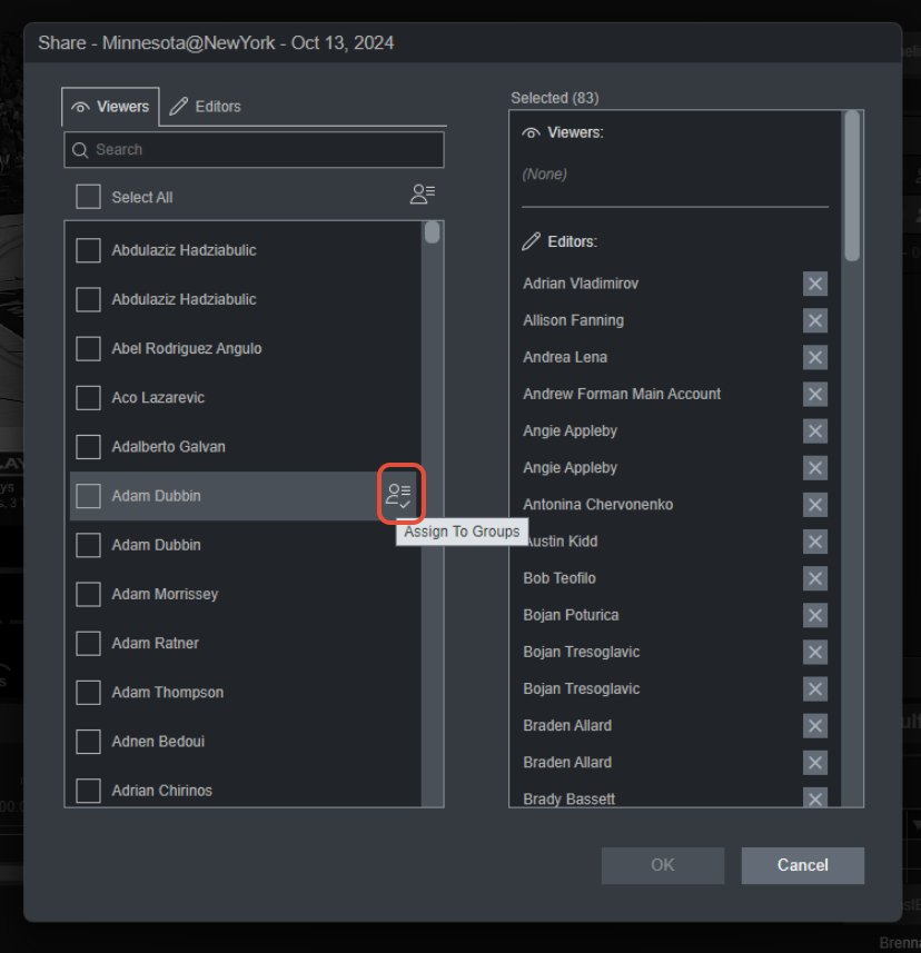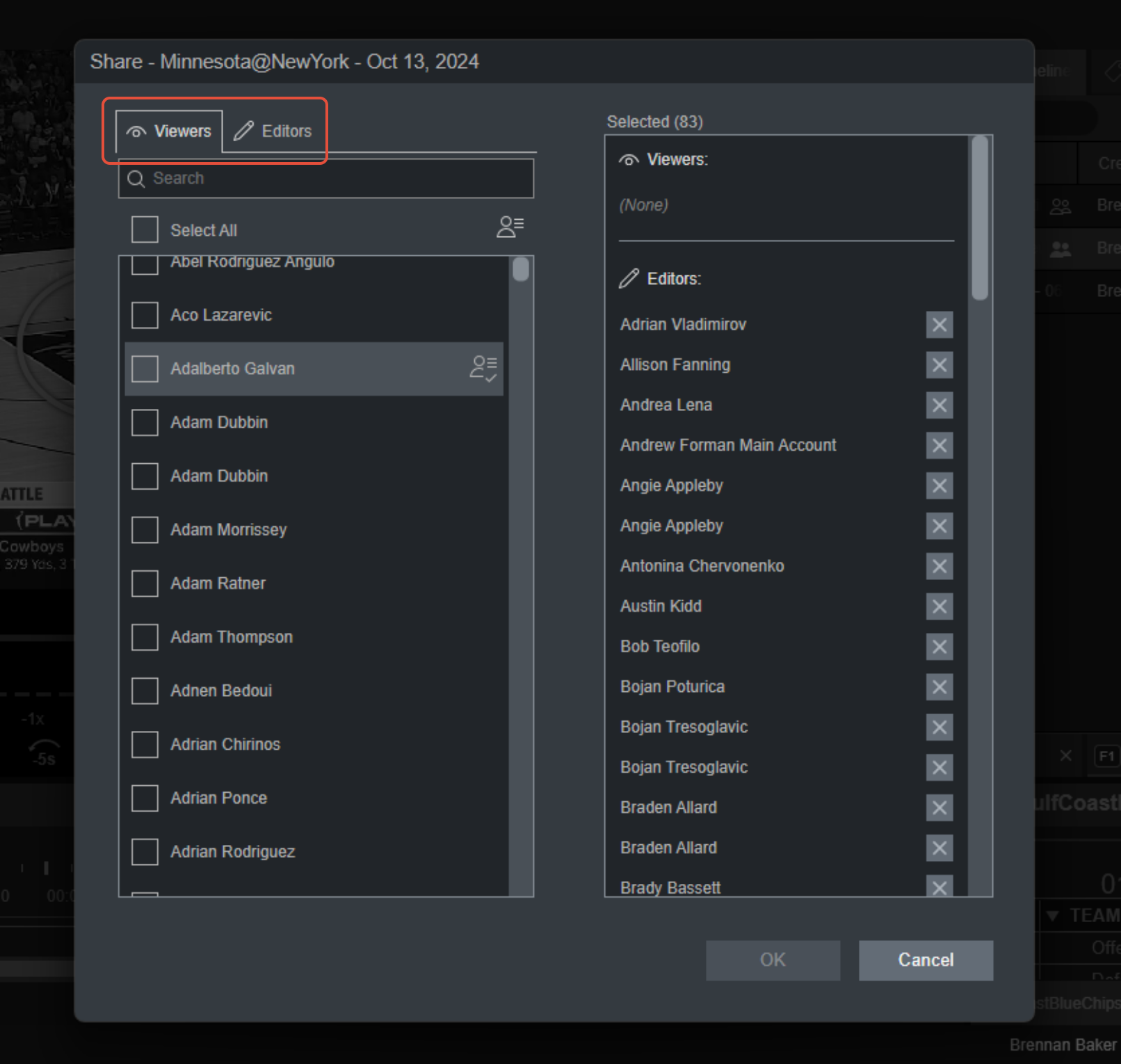 All selected users will appear in the panel on the right, organized by Viewers and Editors. To remove access, simply click the X next to a user’s name, then confirm by clicking OK.