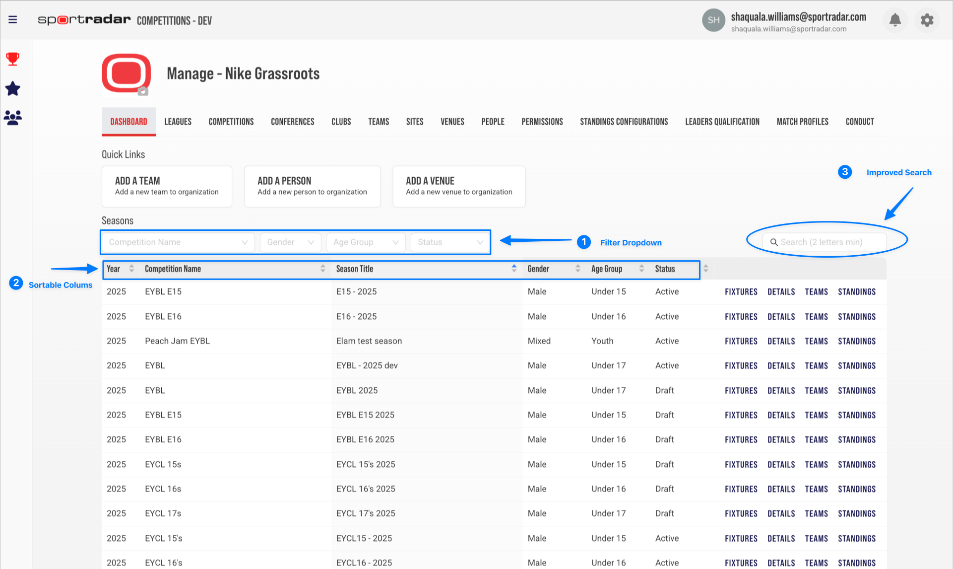 - Default Sortable Columns: Year, Competition Name, Season Title, Gender, Age Group, and Status