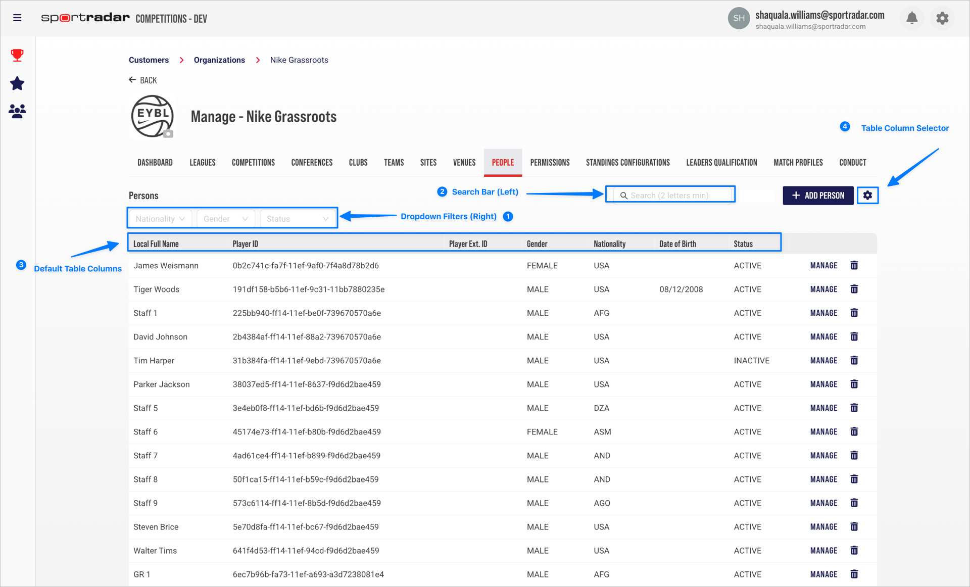 Person List Page (1) Filters, (2) Search bar, (3) Default Columns, and (4) Table column selector control.