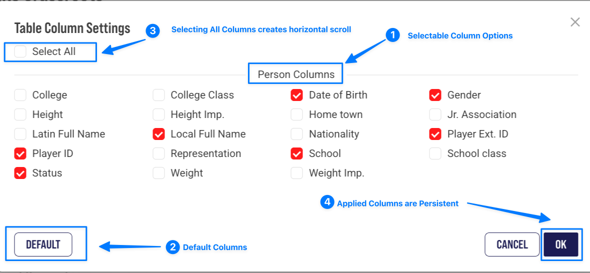 Table Settings: (1) Person Column Fields, (2) Display Default Columns, (3) Display All Columns with horizontal scroll, (4) Persistent Columns