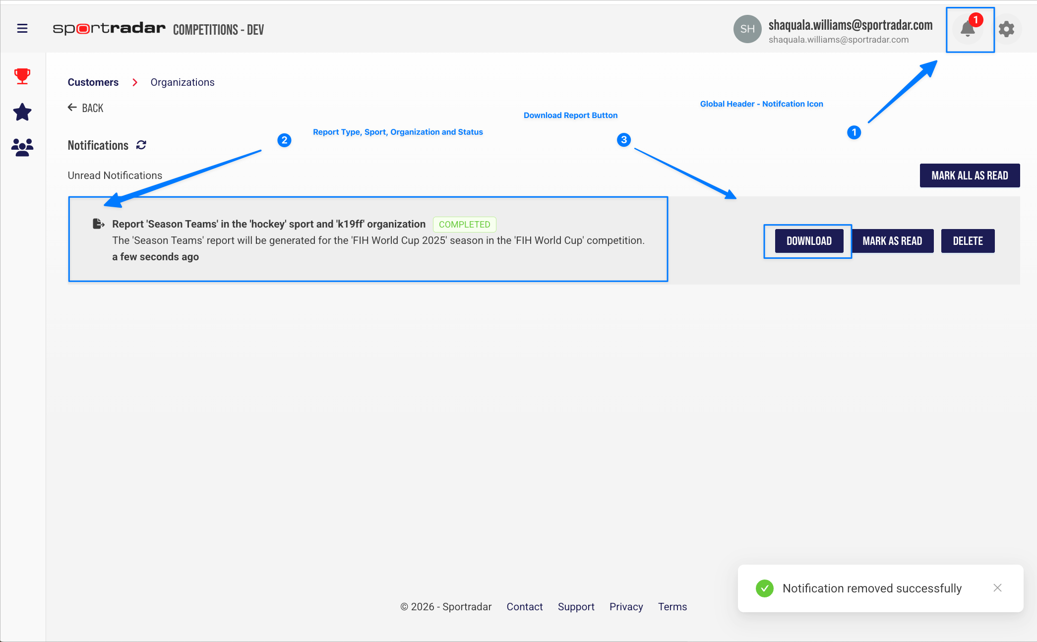 Why it matters: Provides clear feedback on report status, reliable access to season reports during active competitions, and consistent notification workflows for system-generated reports and operations.