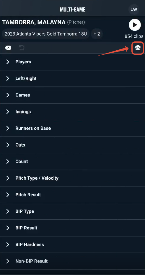 Tap the Event Types icon in the upper right, below the Play icon, to bring up a list of event types. You can make multiple selections