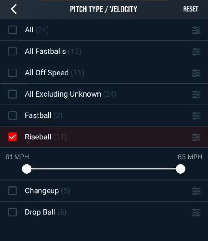 When utilizing the Pitch Type/Velocity Filter, you can first choose a specific pitch type, then use the range filter to precisely define the velocity range for your search results.