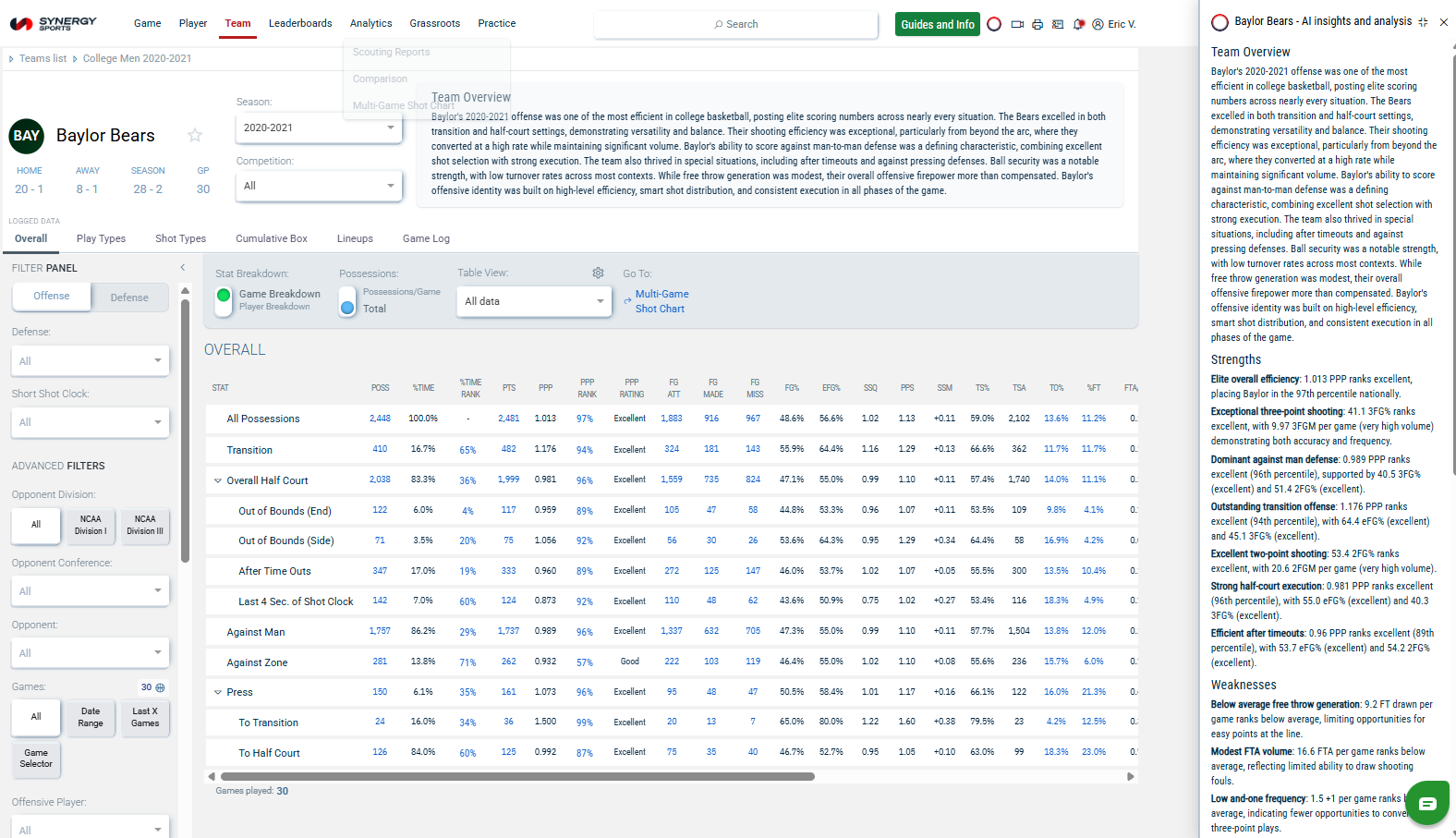 Added Period/Time Filters to Team and Player Pages, for users with Advanced Analytics