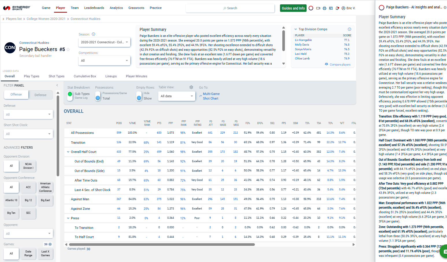 AI Player Summary on Player page for Division 1 College. This will eventually be opened up for all leagues/divisions.
