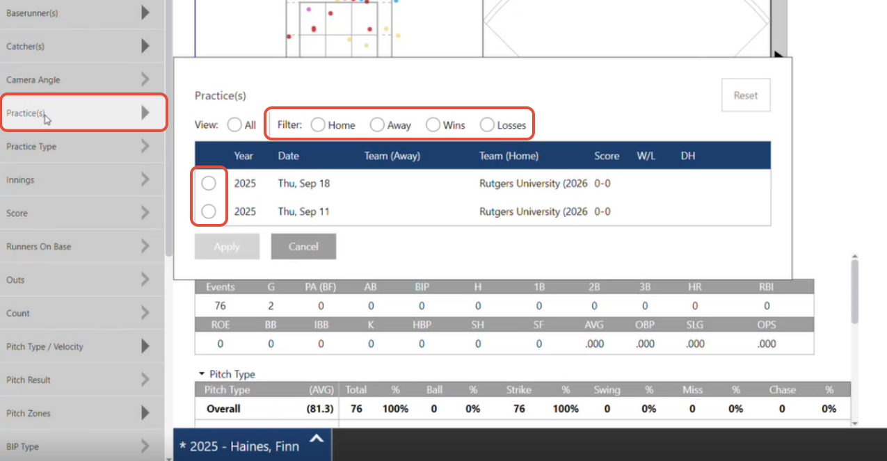 • Swing Result: Narrow your focus by the outcome of each swing, helping you identify patterns in contact, misses, and ball in play results.