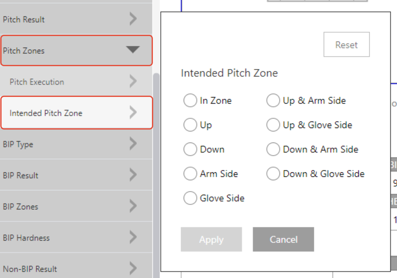 Intended Pitch Zone: Filter by the planned target zone for each pitch, allowing for evaluation of strategic execution.